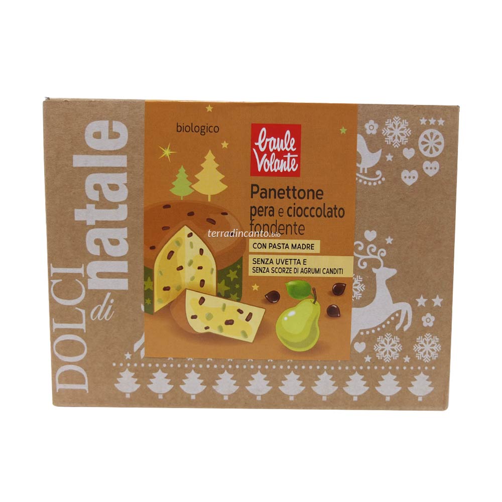 Farina di grano tenero tipo 0, pera candita (pera candita, sciroppo di mais, zucchero integrale di canna, succo di limone), burro, gocce di cioccolato (pasta di cacao, zucchero di canna, emulsionante: lecitina di soia), zucchero integrale di canna, tuorlo d'uovo, pasta madre ( farina di farro, acqua), sale marino, malto d'orzo, burro di cacao, aroma naturale pera, aroma naturale vaniglia.