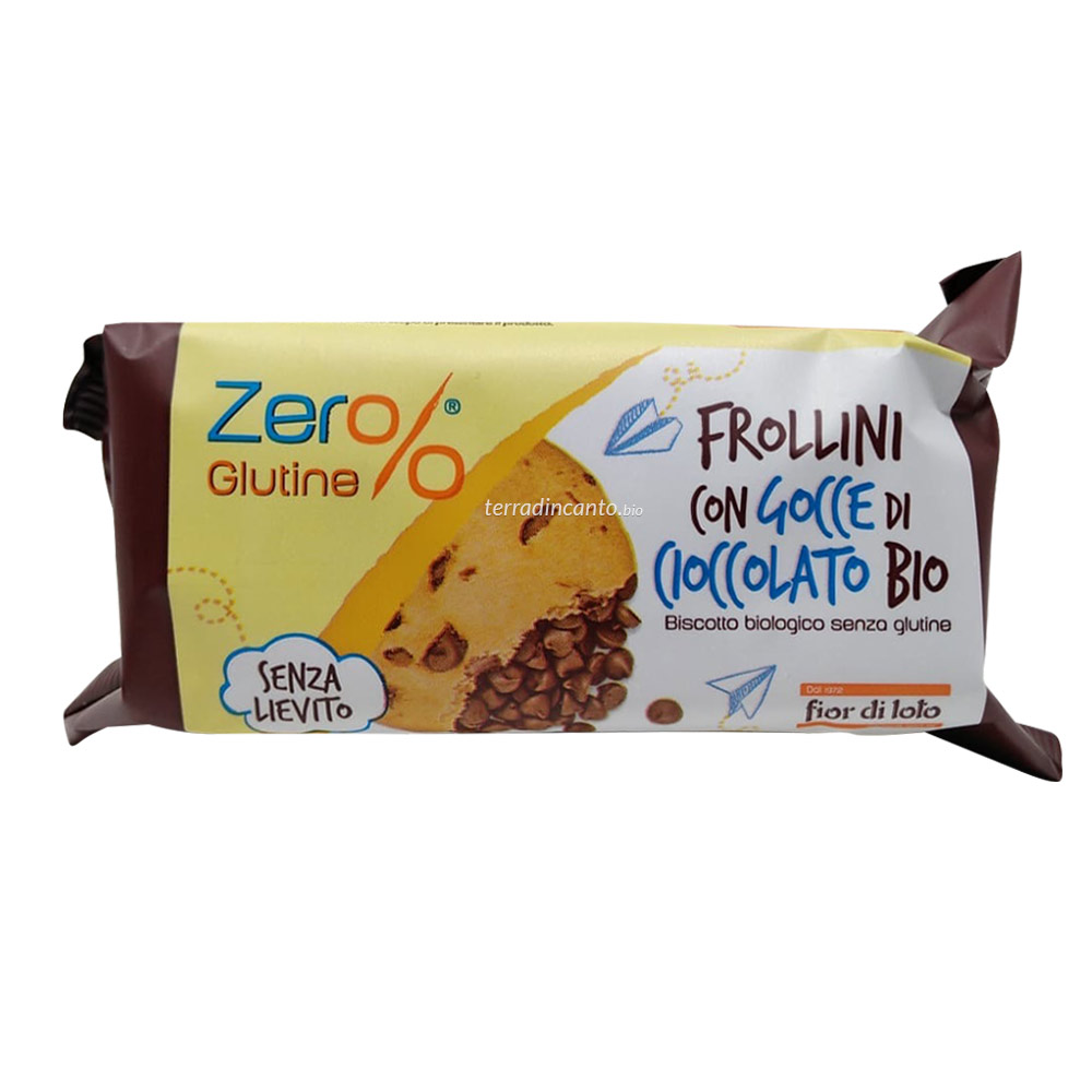 Farina di riso, amido di mais, zucchero di canna, uova, farina di mais, burro, gocce di cioccolato fondente 9,1% (zucchero di canna, pasta di cacao, burro di cacao, emulsionante: lecitina di soia, estratto di vaniglia), farina di riso pregelatinizzata, olio di girasole alto oleico, albume d'uovo, sciroppo di glucosio, amido di tapioca, aroma di vaniglia.