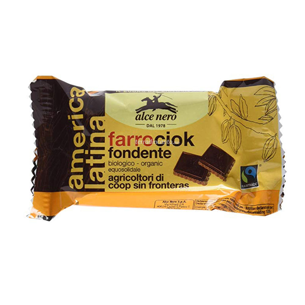 Biscotto: farina di farro 60,1%, zucchero di canna, olio extravergine di oliva, farina di fiocchi d'avena, miele, purea di nocciole, sciroppo di glucosio da mais, agenti lievitanti carbonato acido di ammonio, carbonato acido di sodio, sale; Cioccolato fondente: cacao 55% minimo: massa di cacao, zucchero di canna, burro di cacao, bacche di vaniglia macinate.