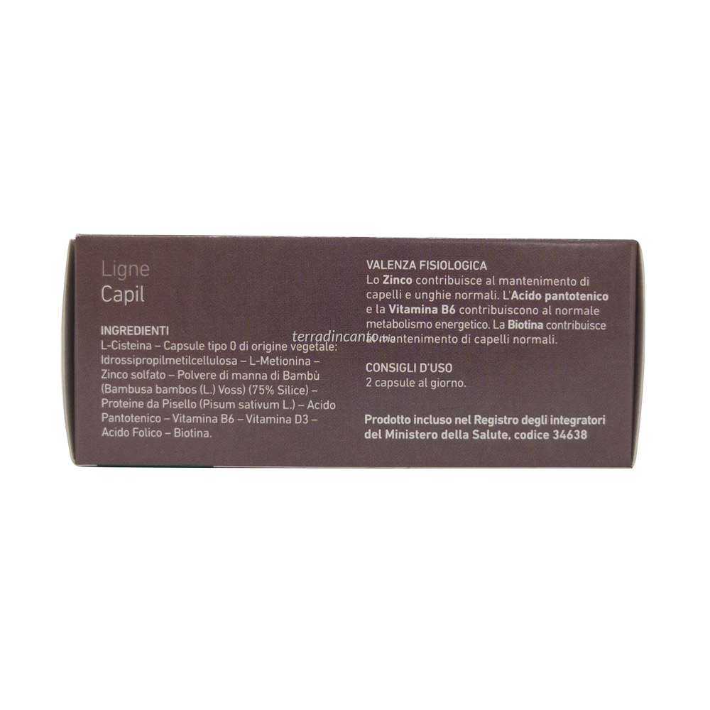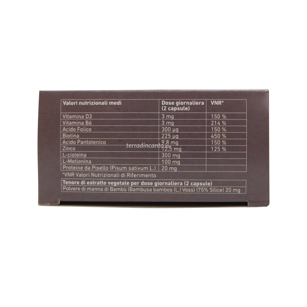 INGREDIENTI L-Cistina - Capsule tipo 0 di origine vegetale: Idrossipropilmetilcellulosa -L-Metionina - Zinco solfato - Polvere di manna di Bambù (Bambusa bambos (L.) Voss.)(75% Silice) - Proteine da Pisello (Pisum sativum L.) -Acido Pantotenico - Vitamina B6 - Vitamina D3 - Acido folico – Biotina.