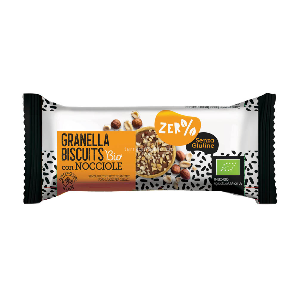 biscotto* 65% (farina di mais*, farina di riso*, zucchero di canna*, olio di semi di girasole*, amido di mais*, uova*, amido di tapioca*, sciroppo di glucosio*, albume d uovo*, miele*, inulina d agave*), cioccolato al latte* 29% (zucchero di canna*, latte in polvere*, burro di cacao*, pasta di cacao*, emulsionante: lecitina di soia*, estratto di vaniglia* -cacao:32% min.), granella di nocciola* 6%. *Biologico.