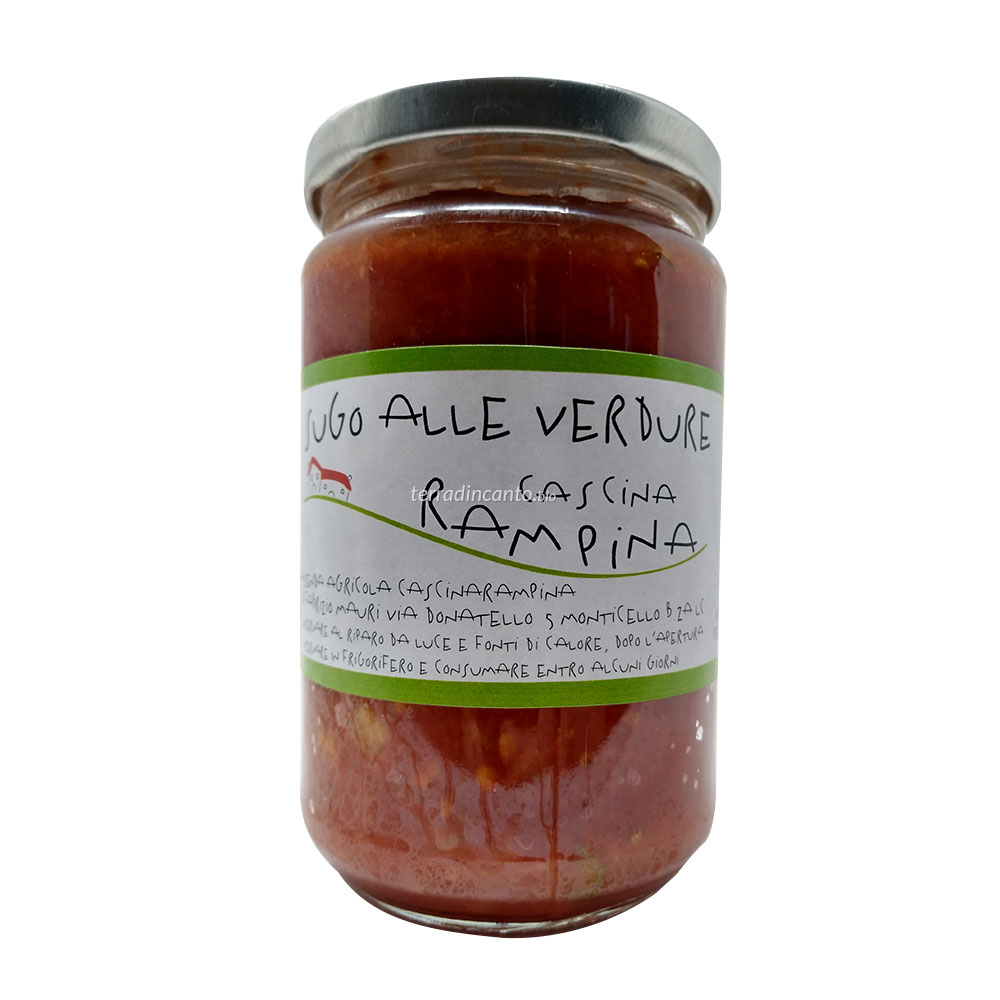 Quando le giornate scottano i pomodori vengono raccolti maturi, a mano. Il sugo viene preparato come una volta, cuocendolo lentamente con tutte le verdure che il nostro orto offre. Già pronto per condire, basta solo aggiungere a crudo un filo di olio buono..