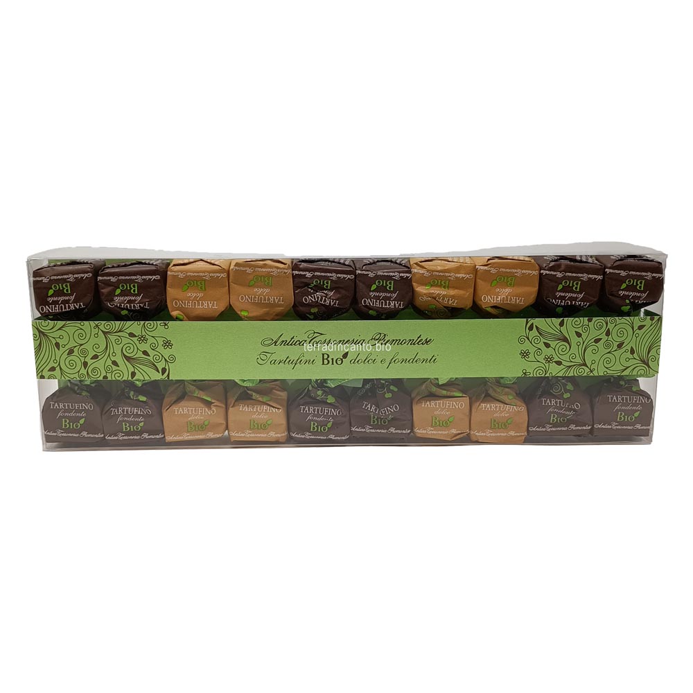 Tartufino dolce con cioccolato al latte: *cioccolato al latte (*zucchero di canna, *burro di cacao, *LATTE intero in polvere, *pasta di cacao. Emulsionante: *lecitina di SOIA) 65%, NOCCIOLE* (granella di NOCCIOLE tostate*, pasta di NOCCIOLA*), polvere di cacao*. *biologico Tartufino dolce con cioccolato fondente: *cioccolato fondente (*pasta di cacao, *zucchero di canna, *burro di cacao. Emulsionante: *lecitina di SOIA. Cacao minimo 58%) 50%, *NOCCIOLE (*granella di NOCCIOLE tostate, *pasta di NOCCIOLA), *polvere di cacao. *biologico