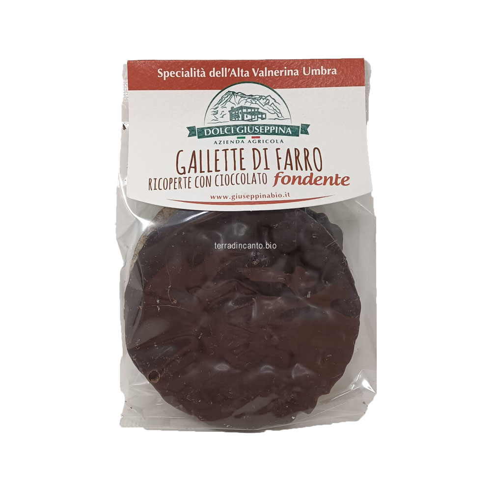 Queste gallette sono state ricoperte da uno strato di cioccolato fondente. La confezione comprende numero due gallette ricoperte al cioccolato per un peso di circa 50g